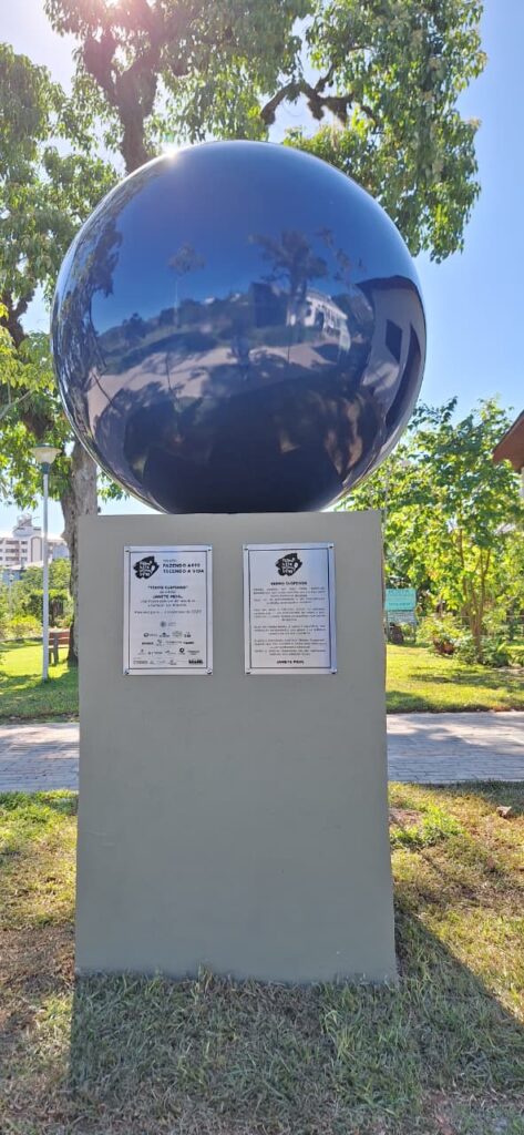 A escultura de Janete Mehl — uma esfera azul de concreto com 1,50 m de diâmetro — representa a perfeição geométrica sem início nem fim: uma forma pura, harmônica e absoluta. O azul sugere profundidade, vastidão, serenidade e mistério. “É o tempo suspenso, daquilo que não envelhece, como uma ideia pura ou um sentimento essencial”, destaca a artista.